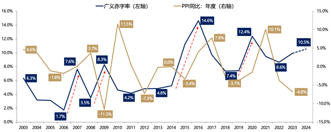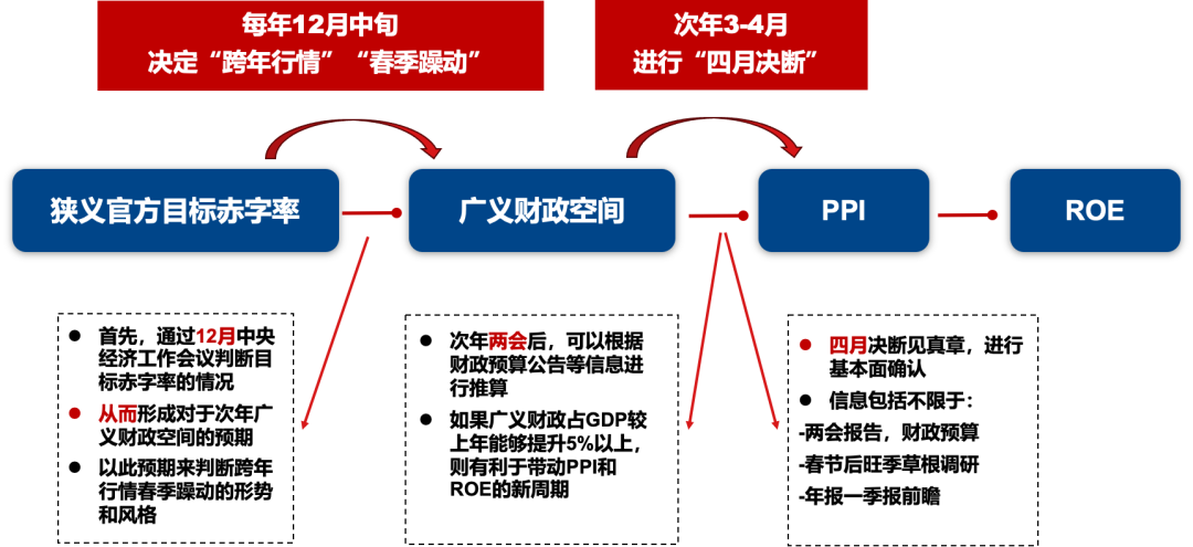 每年12月中旬,政治局会议与中央经济工作会议定调狭义目标赤字,进而影响市场对次年广义财政的预期,最终决定跨年行情的演绎路径及次年“春季躁动”的核心结构。这一逻辑链条为:狭义目标赤字 → 广义财政 → PPI → ROE。