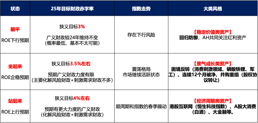 2. 官方目标赤字率小幅提升至3.5%左右,ROE全面回升概率较低,市场维持震荡,行业轮动加快。建议布局困境反转(如消费刺激、磷酸铁锂、军工)、长期破净公司及并购重组主题,同时关注【景气成长类】资产表现。