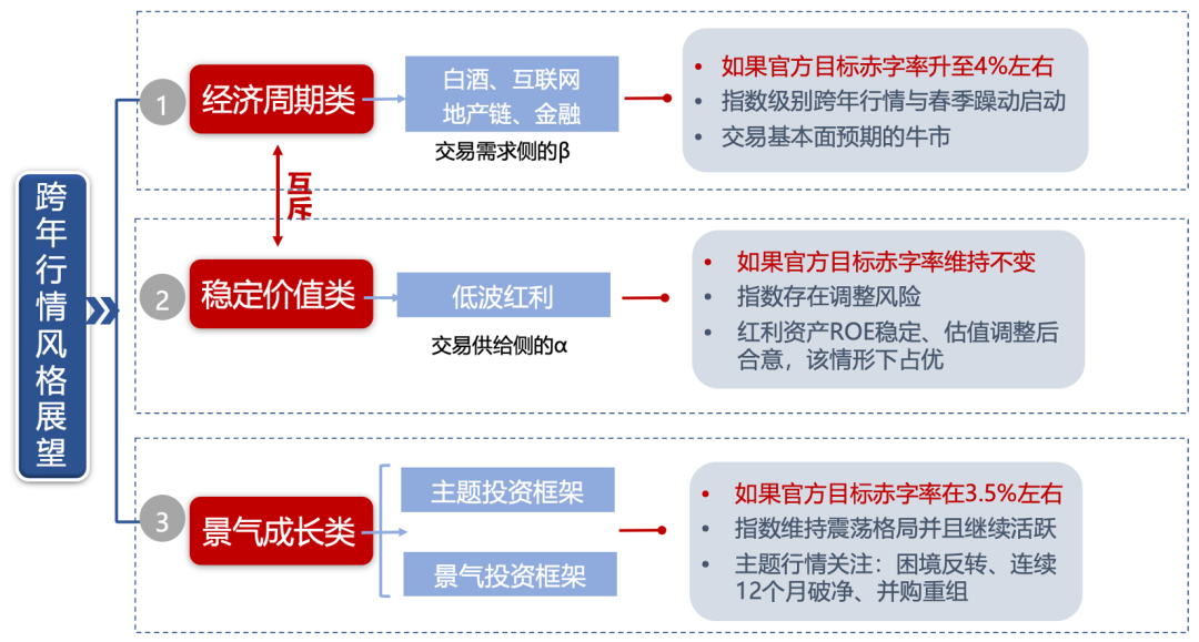 3. 官方目标赤字率进一步提升至近4%,市场将开启“跨年行情”,交易顺周期资产基本面改善预期,如港股互联网(恒生科技指数)、A股大消费(白酒)、大金融等【经济周期类】资产。