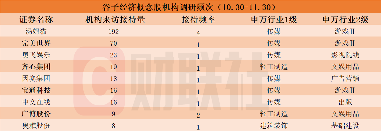 Choice数据显示,10月30日至11月30日期间,多家谷子经济概念股受到机构调研,包括汤姆猫、完美世界、奥飞娱乐、齐心集团、因赛集团、宝通科技、中文在线、广博股份和奥雅股份。其中,汤姆猫和中文在线明确回应了谷子经济相关事宜,接待机构数量分别为192家和16家。