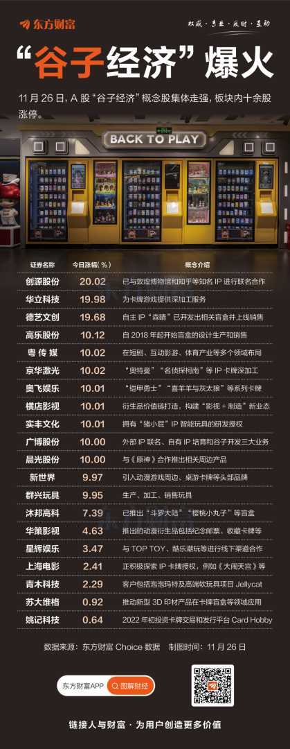 11月26日,市场掀起了一股“谷子经济”热潮,相关概念股表现抢眼,板块内超过十只股票强势涨停,瞬间点燃了投资者对这一新兴消费领域的浓厚兴趣与关注。