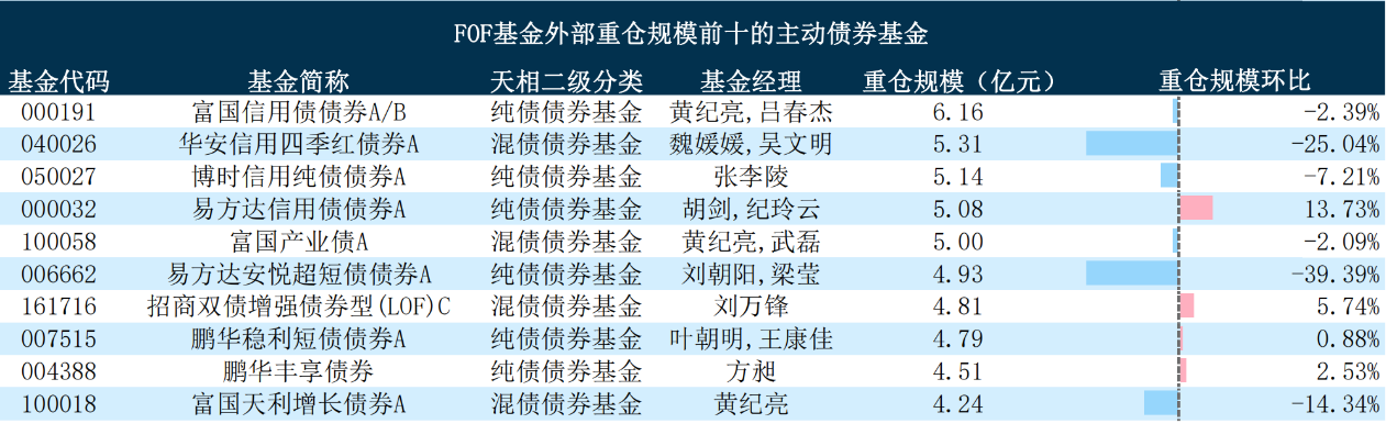 在债基方面,FOF基金持仓以纯债债券基金和混债债券基金为主。其中,交银施罗德裕隆纯债债券A和交银施罗德稳利中短债债券A被FOF基金总体重仓规模最高。此外,富国信用债债券A/B和华安信用四季红债券A等信用债基也受到FOF基金的青睐。