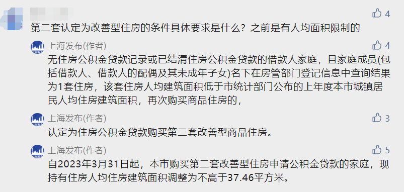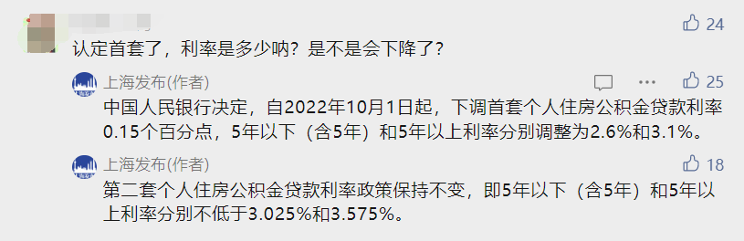 该政策自2023年10月30日起施行,上海市民对此反响热烈。在“上海发布”公众号上,不少市民就政策细节进行了咨询,包括今年6月已贷款如何转换成首套利率、利率是多少、无住房和未使用或已结清两个条件是否需同时满足、第二套认定为改善住房的具体条件是什么等。