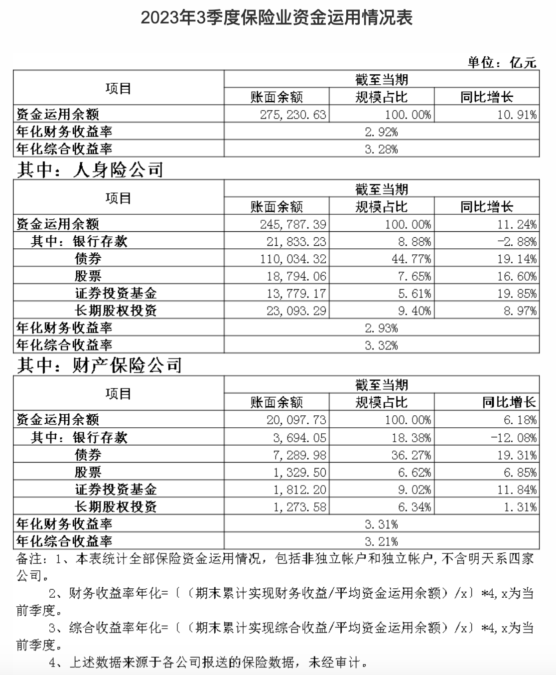 三季度保险业资金运用情况出炉:人身险与财险表现分化