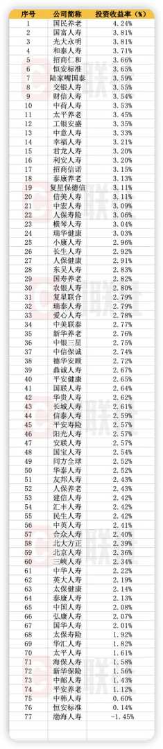 表1 展示了前三季度77家人身险公司的投资收益率情况。
