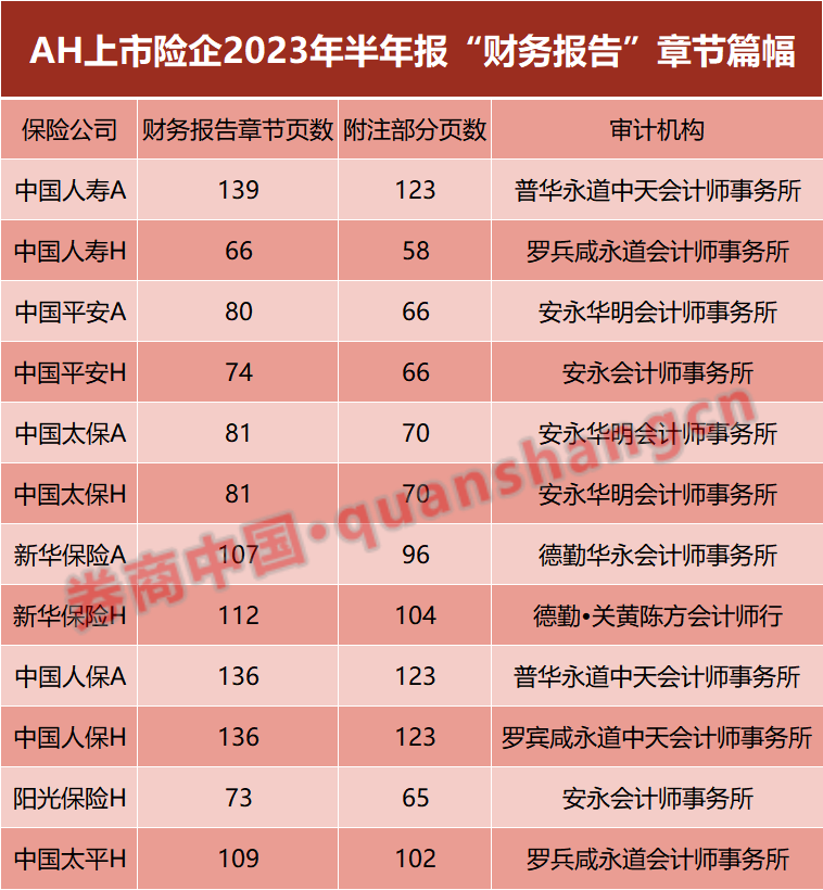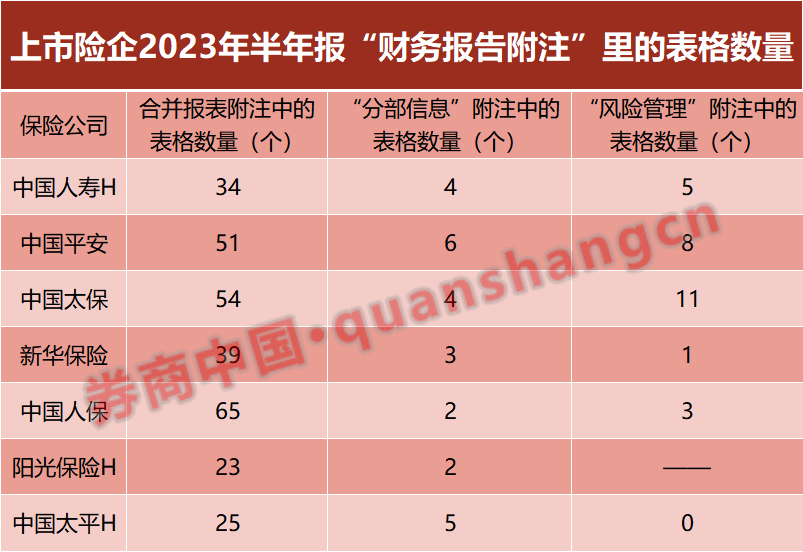 证券时报记者统计了7家上市保险公司在A股、H股市场的12份半年报,发现“财务报告”章节篇幅差异显著,平均篇幅达100页,披露内容的繁简程度各不相同。财务报告附注部分,中国平安和中国太保披露的表格最多,数据颗粒度也相对较细。