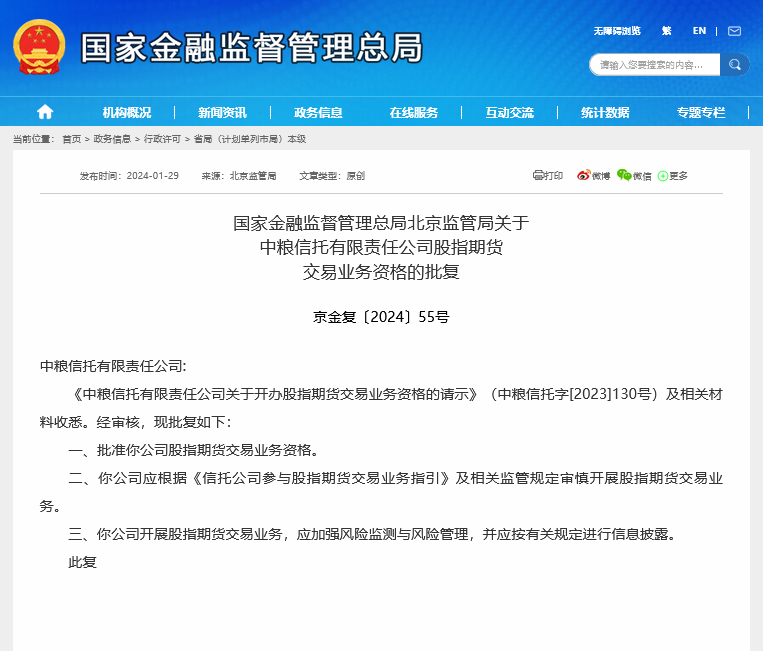 又一家信托公司——中粮信托有限责任公司(简称中粮信托)成功获批股指期货交易业务资格,成为2024年首家获此殊荣的信托机构。1月29日,国家金融监督管理总局北京监管局正式公示了这一消息。