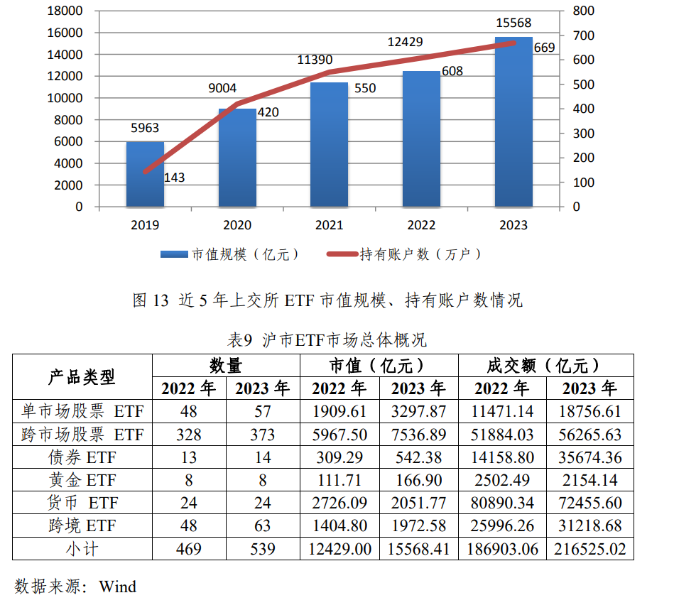 沪市ETF市场表现尤为亮眼,成交额和规模分别位居亚洲第一和第二。截至2023年底,沪市共挂牌ETF539只,规模合计15568亿元,全年成交额达到21.65万亿元,同比增长15.84%。沪市ETF市场的参与度也持续增长,年末持有账户数达到669万户,同比增长10.05%。