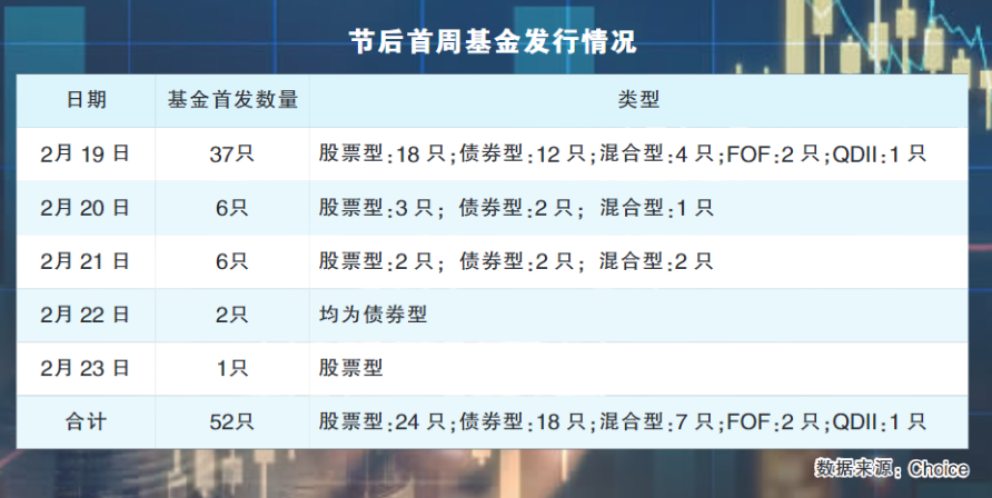 随着春节长假的结束,A股市场迅速恢复活力。节后首周,Choice数据显示,共有52只基金启动发行,其中权益类基金占据主导地位,达到了33只。特别是在长假后的首个交易日(2月19日),基金发行市场更是热闹非凡,共有37只基金进入发行期,权益类基金占比高达23只。