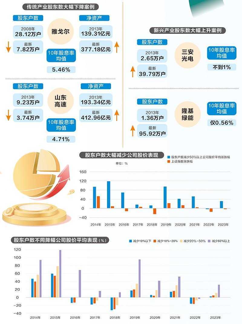 然而,在新兴产业中,龙头公司股东户数却呈现上升趋势。以半导体行业的三安光电和新能源领域的隆基绿能为例,这两家公司股东户数均增长至10年来新高。尽管这些公司也实施了派现,但股息率远低于传统产业龙头公司。