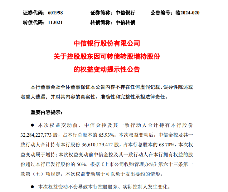 中信银行发布公告称,其控股股东中信金控将所持有的263.88亿元可转债全部转换为A股普通股,增持股份至68.70%,此次权益变动不会导致控股股东、实际控制人发生变化。