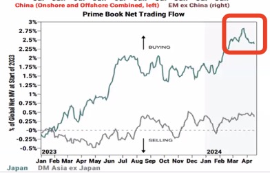 数据显示,过去一周资金回流中国市场的态势显著。外资流入亚洲新兴市场的资金(不含日本)上周达到32亿美元,其中A股增加36亿美元,中国台湾股市净流入0.5亿美元。南向资金净流入13亿美元,北向资金净流入36亿美元。整体来看,截至上周末,A股今年以来已吸引100亿美元北向资金流入,远超2023年全年81亿美元的水平,上周五更是录得30亿美元的外资净流入,为自2021年12月以来最大单日净流入。南向资金延续了22个交易日的净买入态势,港股每日成交额也达到2024年以来最高水平。