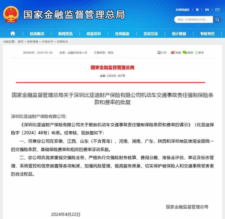 5月6日上午,国家金融监管总局正式回复深圳比亚迪财产保险有限公司(简称比亚迪财险)关于报批机动车交通事故责任强制保险(交强险)条款和费率的请示。总局同意比亚迪财险在安徽、江西等地采用全国统一的交强险条款、基础保险费率和费率浮动系数。