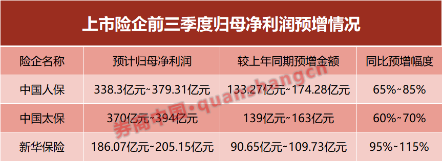 具体来看,中国人保预计2024年前三季度实现归属于母公司股东的净利润为338.30亿元到379.31亿元,同比增长65%到85%;中国太保预计归属于母公司股东的净利润为370亿元到394亿元,同比增加约60%到70%;新华保险预计归属于母公司股东的净利润为186.07亿元至205.15亿元,同比增长95%至115%。