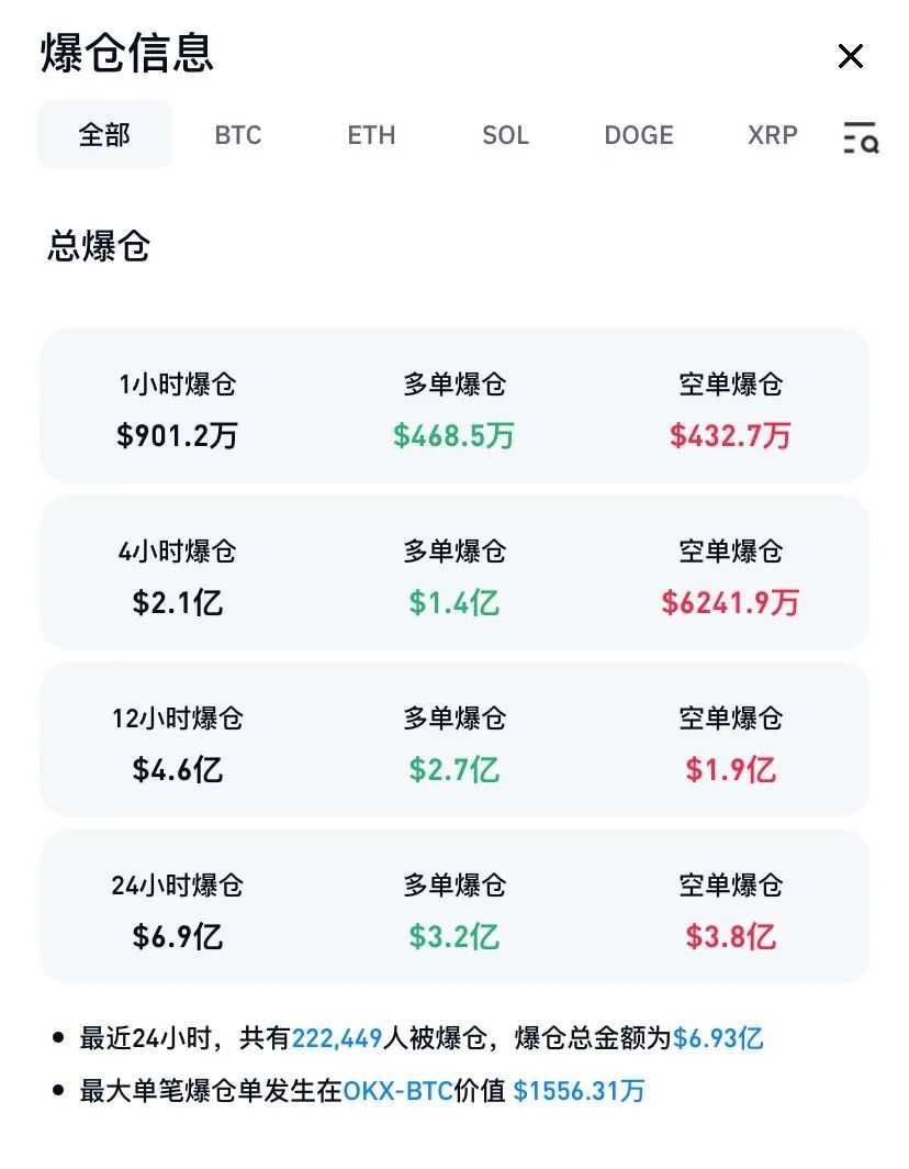 CoinGlass数据显示,过去24小时内,加密货币全网爆仓金额高达6.9亿美元,其中空单爆仓3.8亿美元,多单爆仓3.2亿美元。