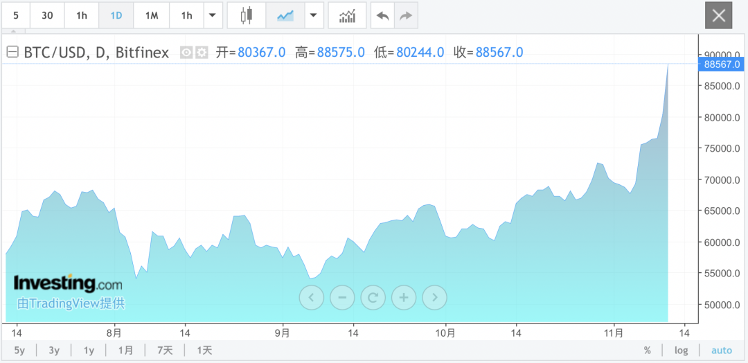 一则震撼消息彻底引爆了金融市场。北京时间11月11日晚间,比特币价格持续飙升,历史性地突破了8.8万美元/枚的关口,截至12日07:00,价格维持在88567美元/枚,再度刷新了历史新高。