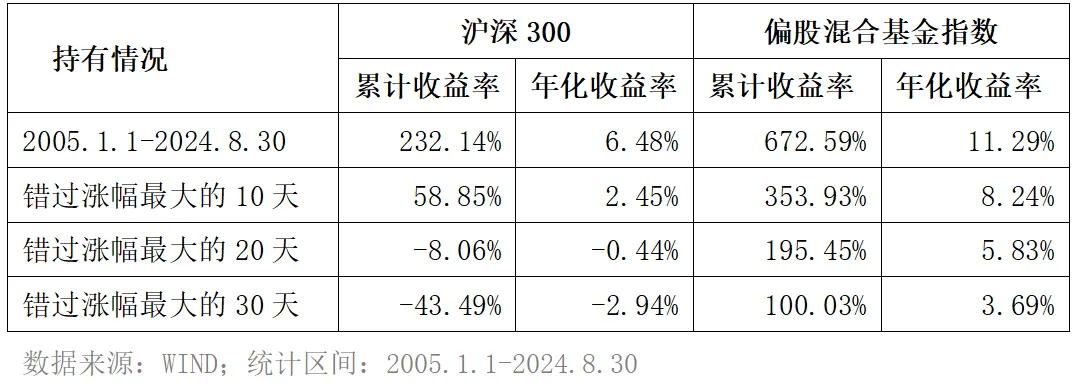 在股市中,该概念被引申为市场停滞不前、投资情绪低迷的阶段,个人无力改变现状、选择“躺平”的时期。回顾A股近20年历史,存在明显的“二八法则”,即80%的时间不赚钱,仅20%的时间盈利。值得注意的是,这种现象不仅存在于A股,海外成熟市场亦如此。美国投资大师查尔斯·艾里斯在《赢得输家的游戏》中提到“闪电理论”,他统计发现,标普500指数在1980-2000年间,若去掉涨幅最大的30天,年化收益率将减半。统计分析显示,投资中80%的收益源自20%的时间,因此必须在“闪电”来临时在场。类似规律同样适用于A股,统计沪深300指数和偏股混合基金指数2005年1月1日至2024年8月30日的情况,错过涨幅最大的10天、20天、30天,收益率将大幅下降。