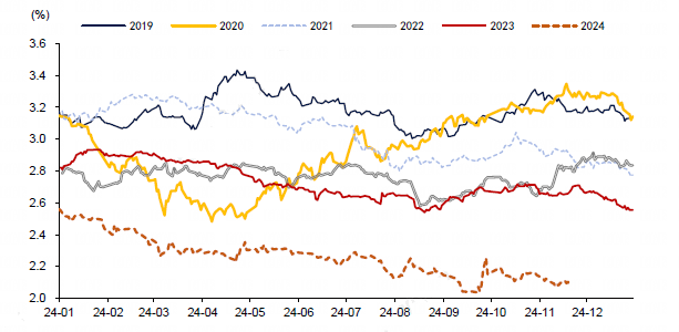 值得注意的是,尽管基本面不一定走弱,但政策博弈仍是关键变量。每年12月,市场对政治局会议和中央经济工作会议的稳增长信号高度关注,而这些会议往往会在力度上与市场出现预期差,从而为债市带来做多机会。此外,资金面也是年末行情的重要驱动因素之一。尽管年末通常是资金面较为紧张的时间,但央行往往会提供流动性对冲,使得资金利率在12月中旬后出现陡峭式下行。