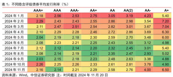 与10月末相比,本月国债3-7年期活跃券利率均下行超过15bp,长端品种10年、30年品种也下行约10bp。而信用债发行利率呈现分化态势,高等级主体利率下行3-11bps,中低等级主体利率则有所上升,特别是在城投、多元金融及商业服务行业。