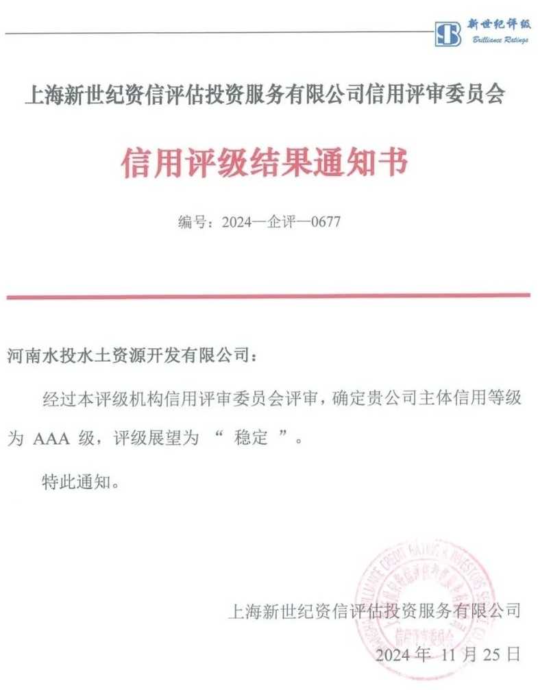 河南水投水土资源公司荣获双机构AAA评级