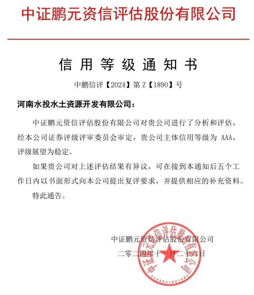 【大河财立方消息深度解析】11月26日,上海新世纪评级与中证鹏元两大权威机构,同时授予河南水投水土资源开发有限公司AAA主体信用等级评价,且评级展望为稳定,标志着该公司在信用评级领域取得了重要突破。