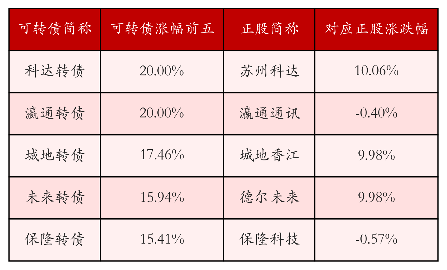 观察可转债对应的正股表现,今日有交易量的可转债中,442只正股收盘上涨,占比达到83.39%,12只正股收盘持平,76只正股收盘下跌。具体来看,44只可转债对应的正股涨幅超过5%,市场表现尤为突出。其中,苏州科达(603660)涨停,收盘上涨10.06%,其对应的可转债科达转债(113569)同样涨停,涨幅达到20.0%。