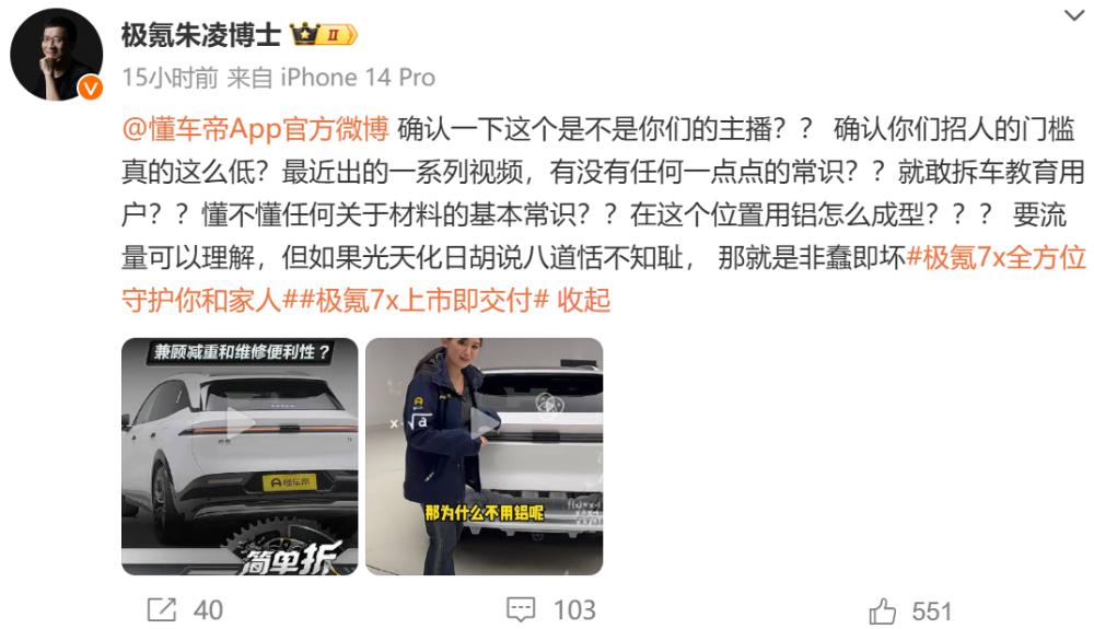 11月26日晚间,极氪(ZK.US)智能科技副总裁朱凌在微博上对懂车帝进行了严厉批评,质疑其对极氪7x及极氪001的拆车视频缺乏专业性。朱凌晒出懂车帝拆车视频截图,并公开@懂车帝App官方微博,质疑视频内容常识性错误,尤其是关于车辆材料使用方面的认知,指出“在这个位置用铝怎么成型?”的疑问。