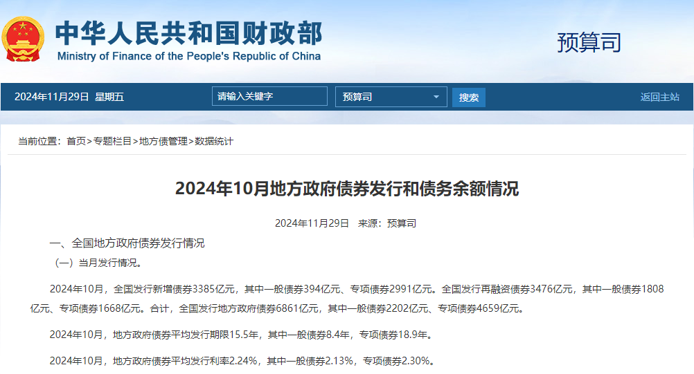 11月29日,财政部官方平台正式揭晓《2024年10月地方政府债券发行及债务余额情况》。