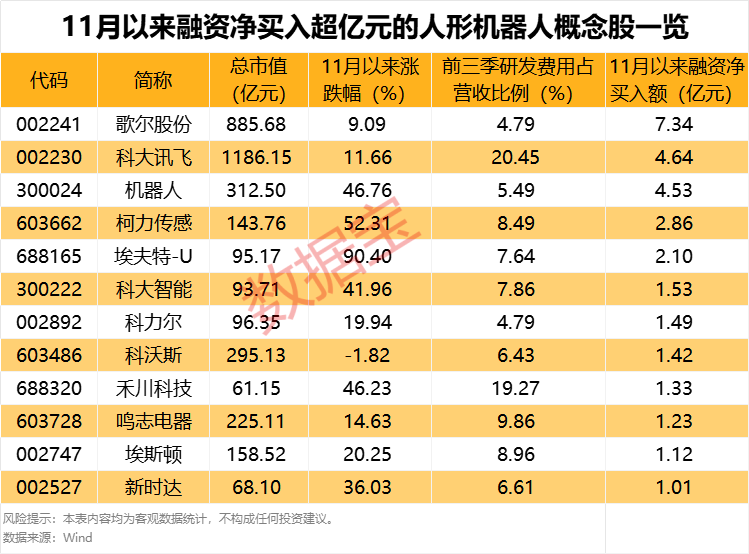 据统计,11月以来,人形机器人概念股股价平均上涨16.43%,超六成相关概念股获得融资客加仓,其中歌尔股份、科大讯飞、机器人等融资净买入额居前。人形机器人相关上市公司整体业绩稳步增长,前三季度合计营收同比增长9.25%,净利润同比增长16.9%。