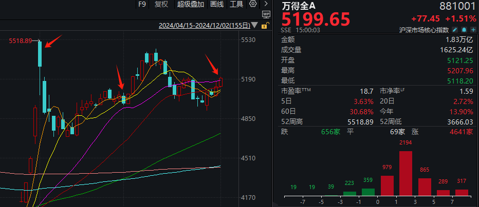 从技术层面看,万得全A和上证指数的阳线均突破了20日均线的压力,释放出更加明确的看多信号。然而,市场未来的压力位依然不容忽视,包括11月19日至21日的中继走势高点3378点、前期下跌过程中的震荡平台底部3402点、10月月K线的中分位3413点以及压力最大的10月月K线实体中分位3477点。