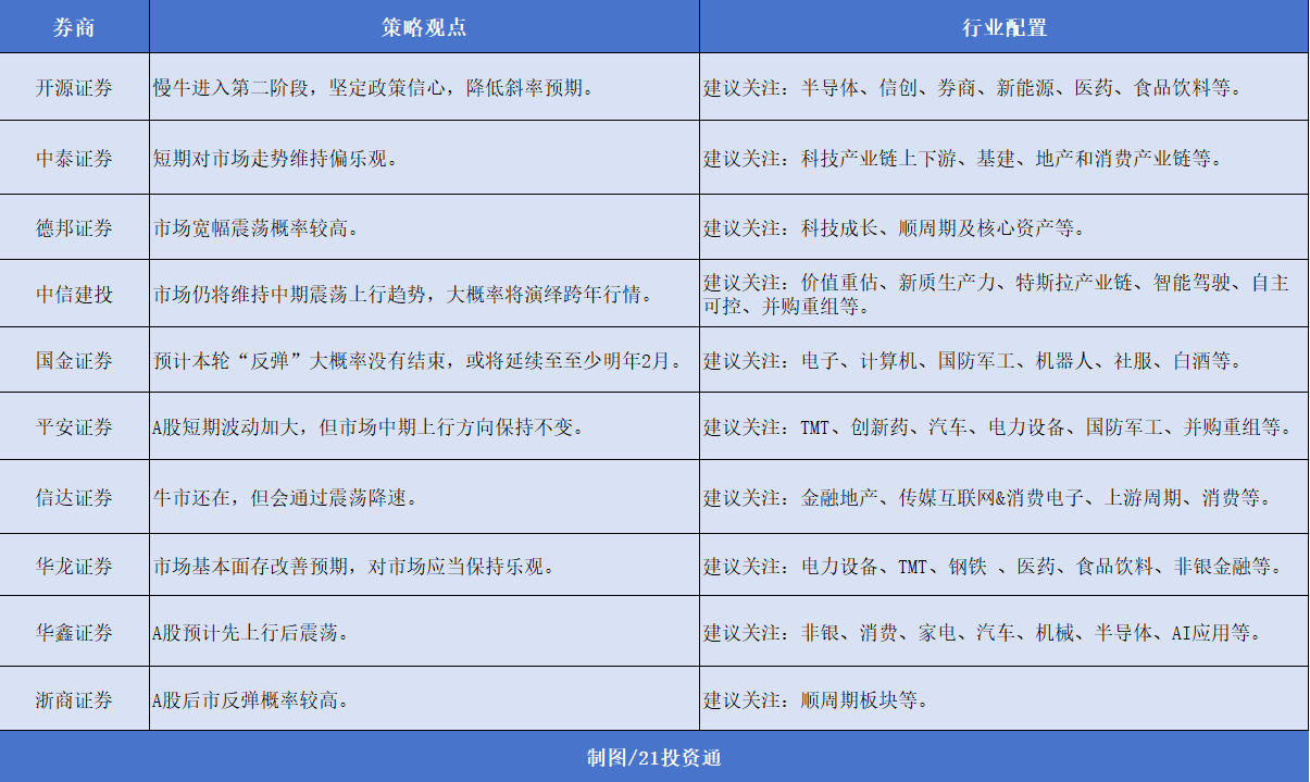 在行业配置方面,半导体、信创等科技风格和高弹性成长方向受到多家机构关注。同时,“顺周期”方向如基建、地产和消费产业链也被频繁提及。