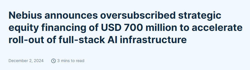 Nebius Group宣布获得7亿美元融资,由Accel、英伟达等投资,将加速全球AI基础设施建设。Nebius股票飙升近27%,创始人沃洛日表示将加速推进AI基建,并期待获得英伟达新一代芯片。