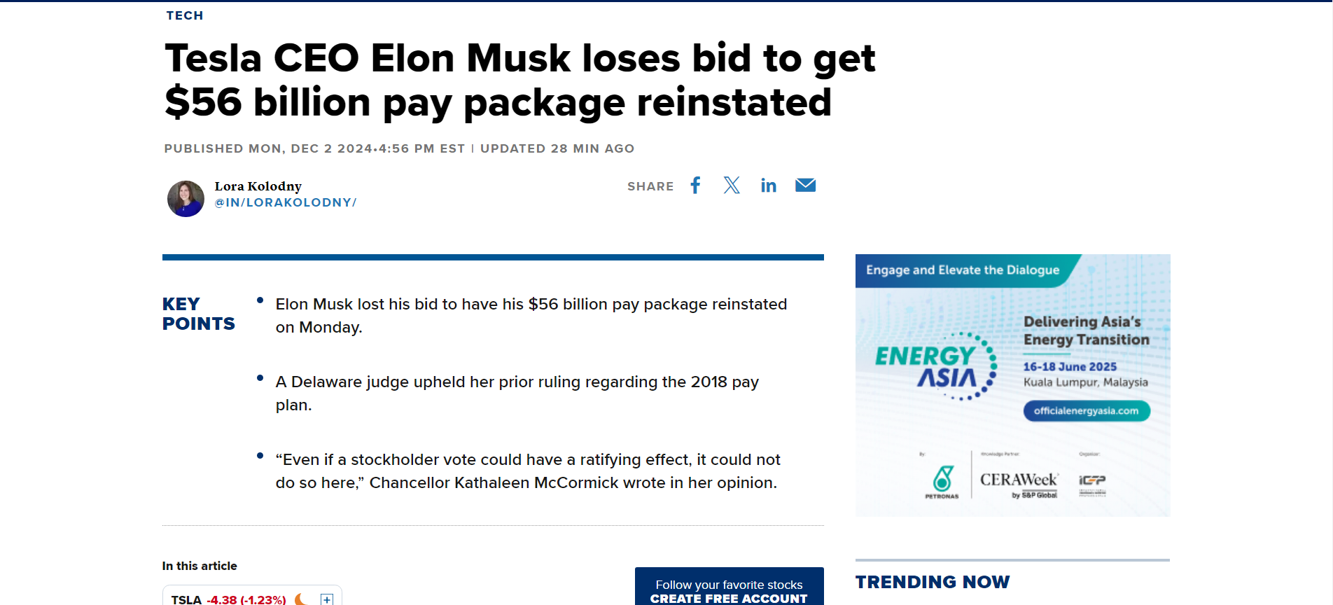 麦考密克的裁决推翻了美国企业高管史上最高薪酬方案,若上诉失败,或将大幅削减马斯克的财富,并对其公司的未来造成深远影响。马斯克有权向特拉华州最高法院提起上诉。