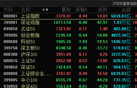 午后,市场一度出现跳水行情,但在泛金融板块的引领下,迅速翻红。截至收盘,主要指数表现分化,上证指数微涨0.44%,深证成指下跌0.4%,创业板指同样下跌0.44%。全天市场成交额为1.76万亿元,较前一交易日减少694亿元,全市场超过2700只股票下跌。