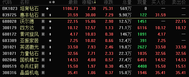 在板块方面,第四代半导体概念全天表现强劲,尤其是金刚石半导体概念,成为市场亮点。个股中,慧丰钻石、黄河旋风、亚振家居涨停,沃尔德、四方达等涨幅超过10%。