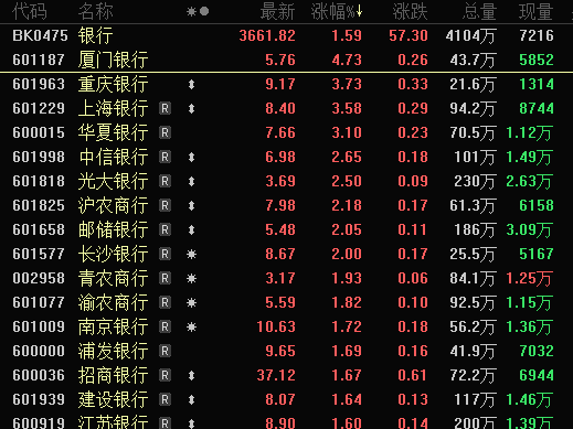 金融板块表现同样不俗,银行板块领涨,厦门银行、重庆银行、华夏银行等涨幅居前。