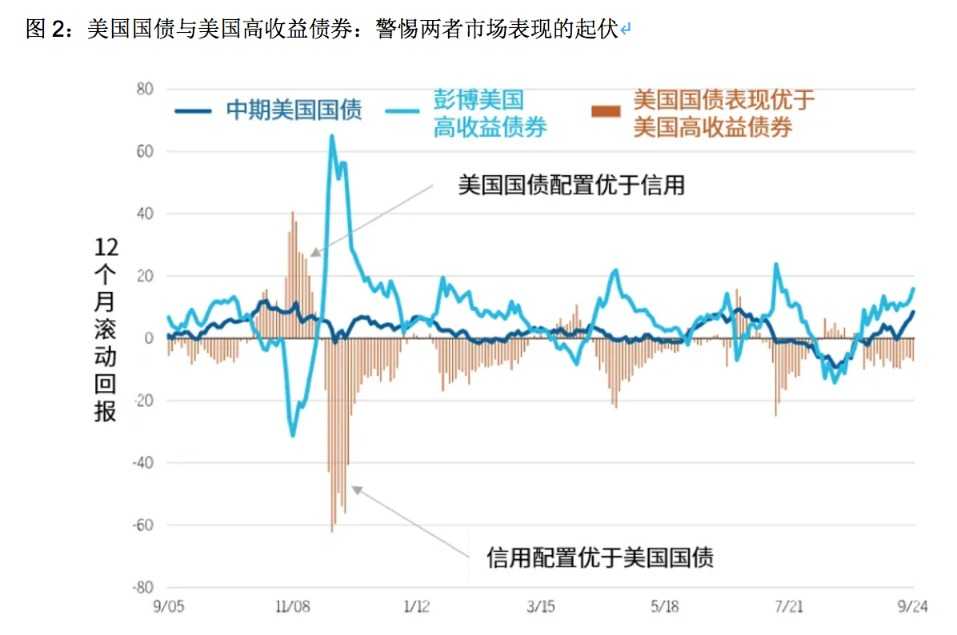 高波动性使债券投资更加复杂,但也为投资者提供了机遇。在动态配置策略下,投资者需根据市场变化迅速做出决策,灵活应对违约周期、信用周期及央行政策变化等挑战。静态配置投资级信用在市场条件适宜时可能有效,但可能错失其他领域的机遇。通过动态配置,投资者可以根据市场条件调整投资组合,把握机遇,降低风险。如图2所示,通过比较美国国债和高收益债券在不同时期的相对表现,可以发现灵活配置的潜在优势。