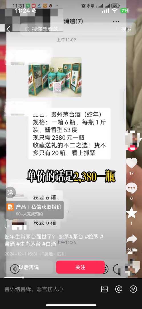 由于蛇茅在终端市场具有较大的炒作空间,目前网上已出现仿冒蛇茅的假货。某抖音博主发布的视频显示,有人在微信群中发布了贵州茅台酒(蛇年)的预定消息,售价仅为2380元/瓶。该博主根据外包装判断其为假蛇茅,并认为这可能是一个新型骗局。
