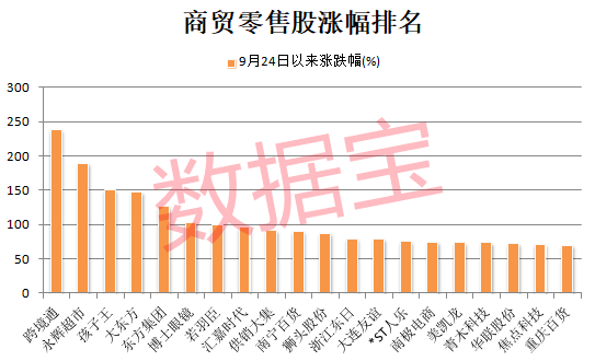 在永辉超市的带动下,商贸零售板块多只股票表现不俗。12月4日,家家悦、国光连锁、红旗连锁、中百集团、汇嘉时代、皇庭国际等多只股票盘中触及涨停板。据统计,自11月1日以来,商贸零售指数累计上涨15.77%,涨幅居行业首位。若从9月24日算起,商贸零售指数累计上涨53.74%,排在行业第三位。期间,跨境通、永辉超市、孩子王、大东方、东方集团、博士眼镜等6只商贸零售股涨幅翻倍。