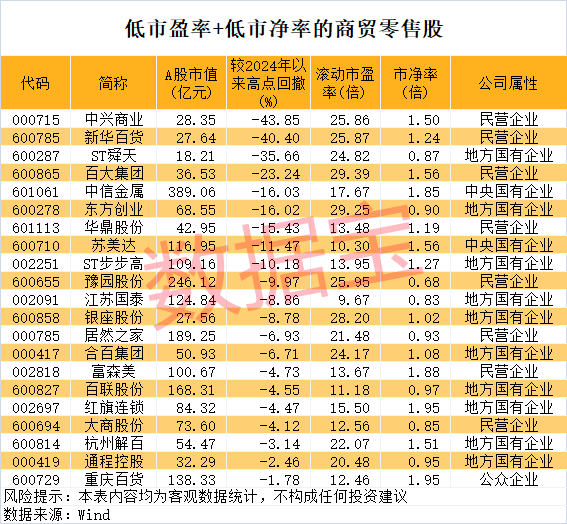 从估值水平来看,截至12月4日收盘,商贸零售行业股票中,滚动市盈率(PE)低于30倍的有30只,其中江苏国泰滚动市盈率为9.67倍,排在最低位置。市净率(PB)方面,43股市净率低于2倍,其中17股处于破净状态。滚动市盈率低于30倍且市净率低于2倍的股票有21只,其中超半数属于国资企业,包括苏美达、中信金属等中央国有企业,以及江苏国泰、百联股份等地方国有企业。