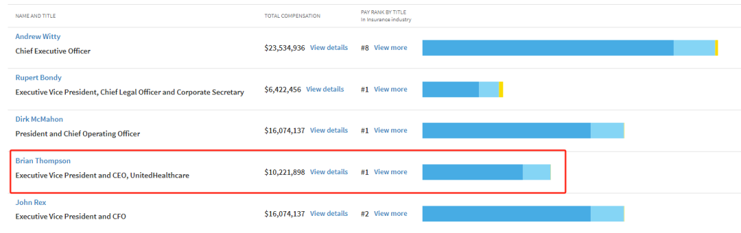 根据公开资料,汤普森在加入联合健康集团前,曾在其他公司担任财务总监和公司发展总监等职务。在联合健康集团内部,他逐步晋升,并最终成为首席执行官。据悉,他的薪酬高达1022万美元(约合人民币7430万元),并持有3.29万股公司股票,当前市值约为2000万美元(约合人民币1.45亿元)。