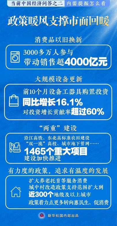 培育新引擎、拓展新空间,中国经济纵深空间不断打开。同时,也要看到当前居民消费能力和消费意愿依然不足,民间投资预期较弱等问题。党中央果断决策,一揽子政策协调配合、同向发力,扩内需导向十分鲜明。