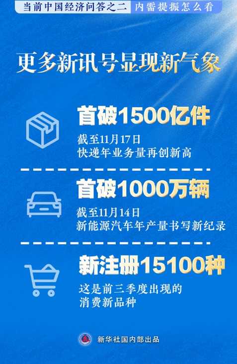 快递年业务量首破1500亿件、新能源汽车年产量首破1000万辆、前三季度消费新品种注册量达15100种……新讯号显现新气象,中国经济活力潜力不断释放,高质量发展的脚步更加笃定。