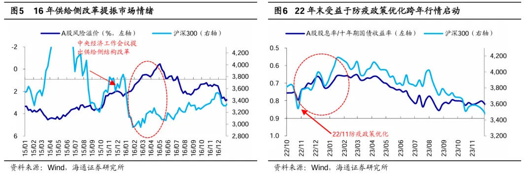 年末至年初是政策事件窗口期,政策对股市具有积极提振作用,增强市场对政策预期,促进跨年行情上涨。如2008年末的“四万亿”投资计划、2013年末的全面深化改革、2014年末的“大众创业、万众创新”口号、2016年的供给侧改革以及2019年的股市政策等,都是推动市场情绪和行情的关键因素。