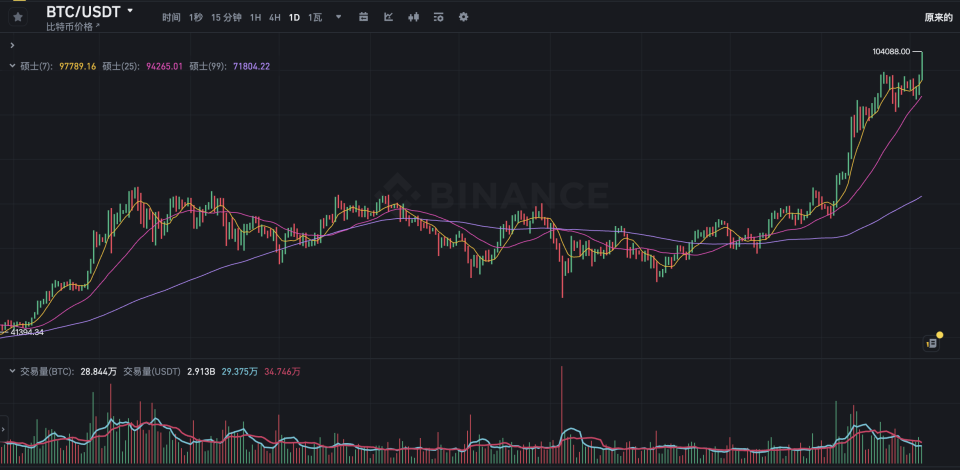回溯至一个月前,即11月4日,比特币价格尚徘徊在6.74万美元左右。彼时,美国大选结果尚未揭晓,市场氛围紧张。然而,在11月6日凌晨,美国共和党总统候选人特朗普宣布赢得大选,此后比特币价格便如脱缰野马,一路飙升。
