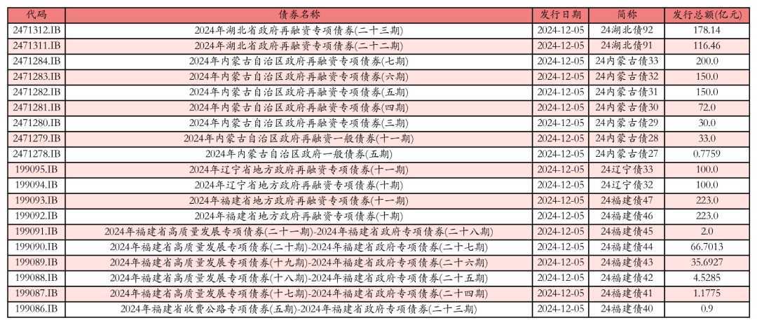 2024年12月5日,全国共发行19支地方政府债,总规模近1687.4亿元。内蒙古、湖北、福建和辽宁发行规模靠前,各债券全场中标倍数均较高,显示出投资者对地方政府债券的高度认可。