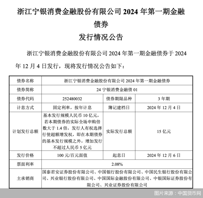 北京商报讯(记者岳品瑜董晗萱)年末之际,持牌消金公司的“发债潮”势头不减。12月5日,中国货币网公告显示,浙江宁银消费金融股份有限公司(简称“宁银消金”)成功发行了2024年第一期金融债券,发行总额为15亿元,票面利率为2.08%。