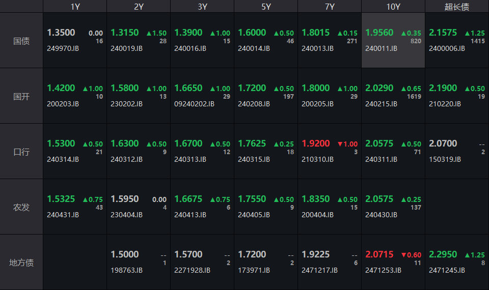 银行间主要利率债市场方面,收益率普遍上扬。截至北京时间16:30,10年期国债活跃券240011收益率上行0.35个基点至1.956%,30年期国债活跃券2400006收益率上行1.25个基点至2.1575%,10年期国开活跃券240215收益率上行0.65个基点至2.029%。