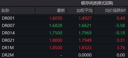 银行间回购定盘利率集体上扬。FR001上涨4个基点至1.6800%,FR007上涨3个基点至1.8500%,FR014亦上涨3个基点至1.8800%。相比之下,银银间回购定盘利率保持稳定,FDR001、FDR007及FDR014均与前一交易日持平。