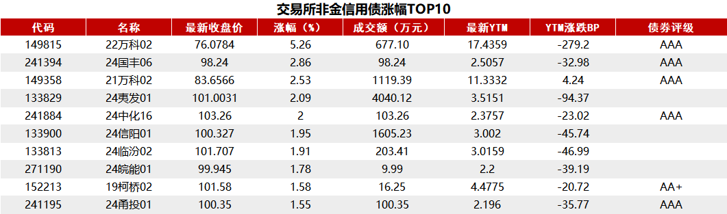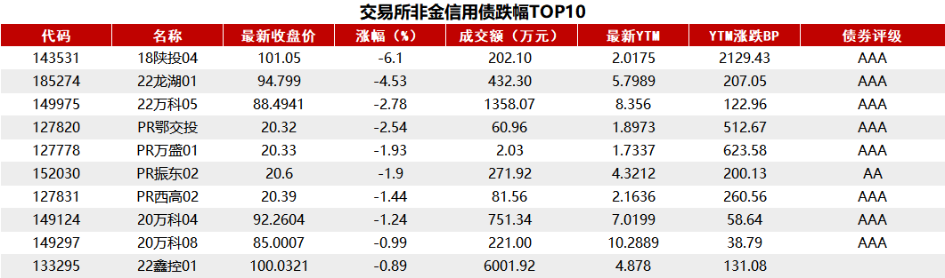 交易所信用债市场表现分化,涨跌互现。据Choice数据统计,今日交易所市场非金信用债跌幅前五名分别为18陕投04、22龙湖01、22万科05、PR鄂交投、PR万盛01;而涨幅前五名则分别为22万科02、24国丰06、21万科02、24夷发01、24中化16。